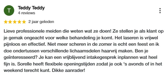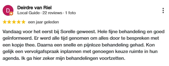 "Ik kom al een jaar voor laser en gezichtsbehandelingen bij Sorelle, ik ben zeer tevreden! Ik word altijd vriendelijk en professioneel geholpen. Ook is de salon erg netjes en hygiënisch. Zeker een aanrader!"